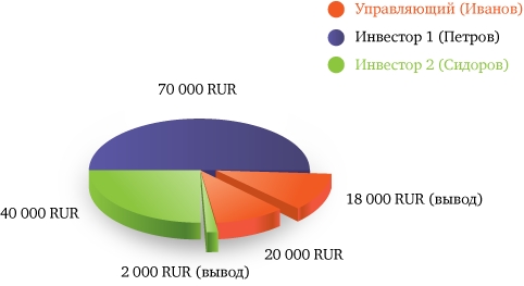 Соответственно, Инвестор 1 (Петров) получил прибыль равную 50% (25 000 RUR)