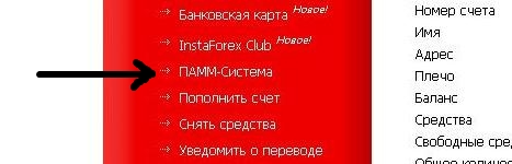 1) Входим в свой личный кабинет InstaForex и нажимаем в меню на ПАММ-СИСТЕМА.